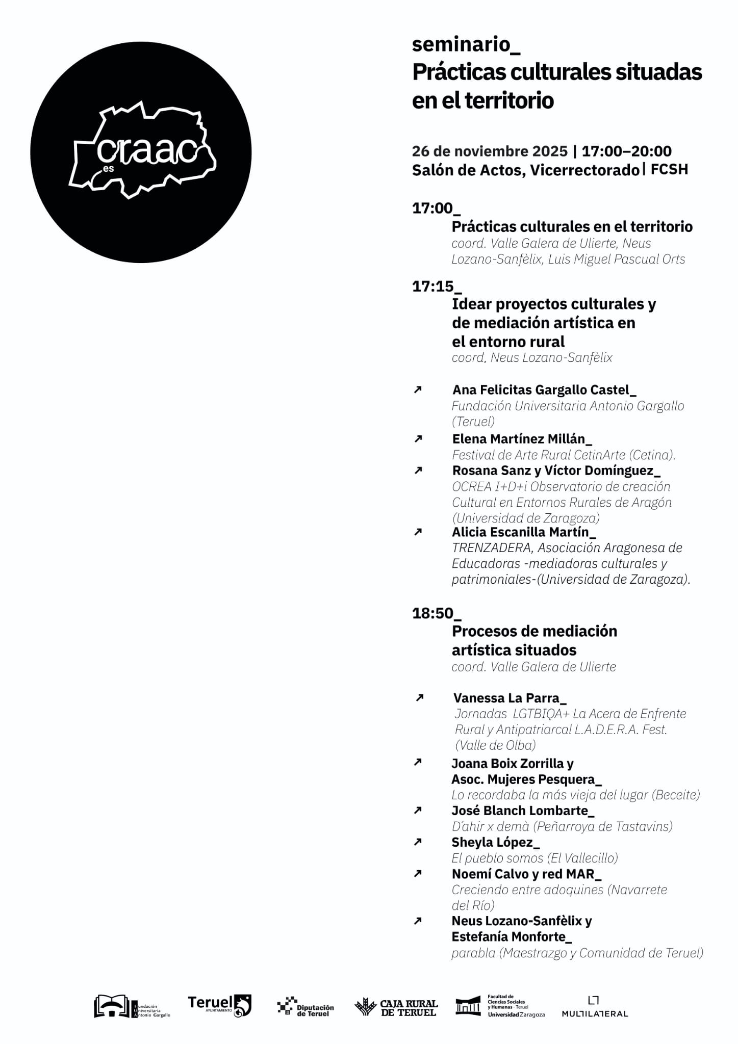Se presentará una cartografía online y geolocalizada de los agentes culturales de Aragón inscritos en CRAAC, la publicación en papel de la edición anterior del Seminario y mesas redondas de profesionales. En ellas compartiremos proyectos de mediación, experiencias y metodologías impulsados o respaldados por diferentes artistas, gestores culturales, educadores, plataformas, festivales de arte, institutos científicos, organizaciones privadas, y asociaciones y colectivos sin ánimo de lucro en Teruel.